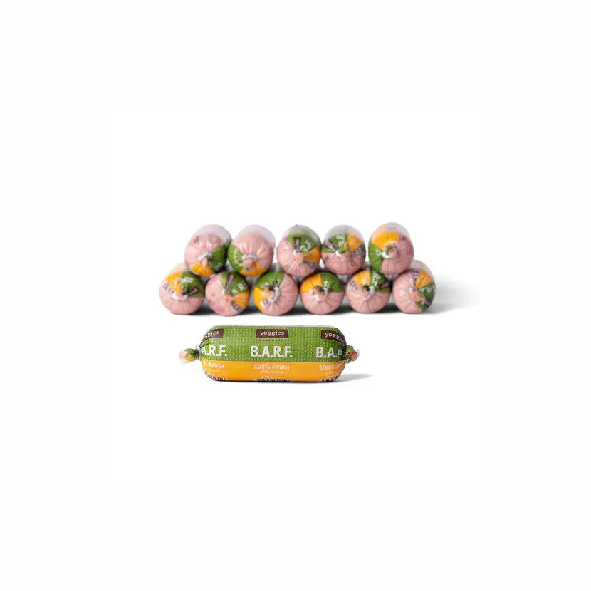 Surové kompletné krmivo pre psov (Yoggies B.A.R.F.) s probiotikami. Receptúry sú vyvinuté tak, aby sa čo najviac podobali prirodzenej potrave psa a obsahujú iba kvalitné mäsa z kontrolovaných chovov. Surové mäsa Yoggies B.A.R.F. obsahujú špeciálne probiotiká pre psov, ktoré podporujú imunitu i odolnosť proti vírusom, parazitom i chorobám a pridaná je aj kĺbová výživa, ktorá podporuje stavbu kostí i zdravie pohybového aparátu psa.