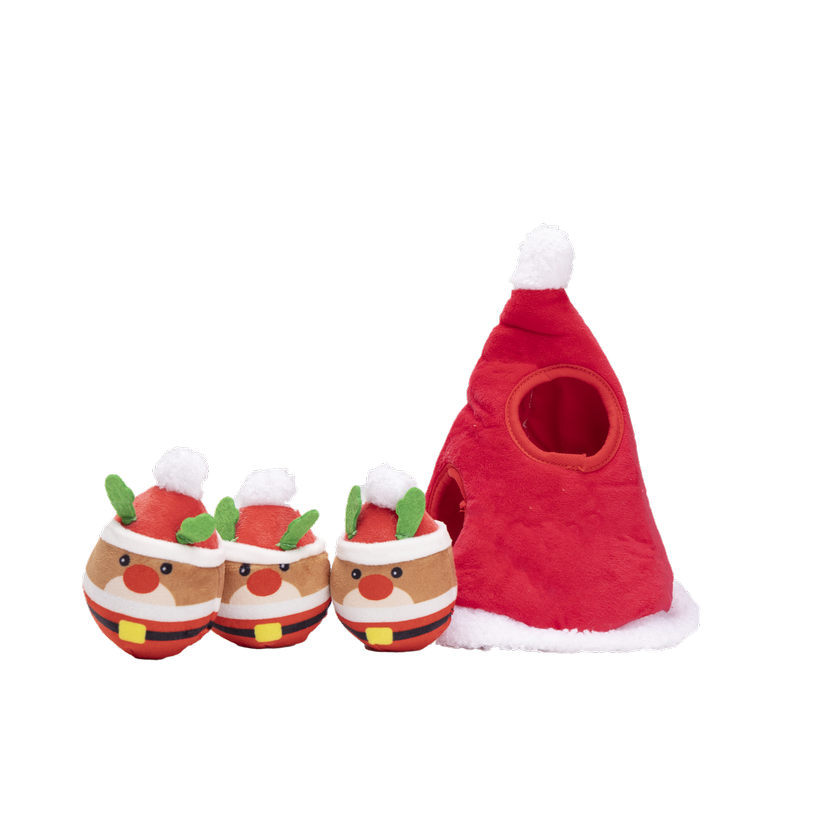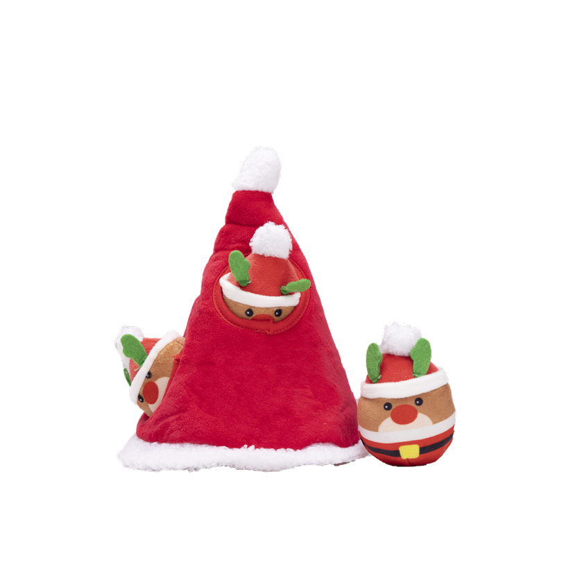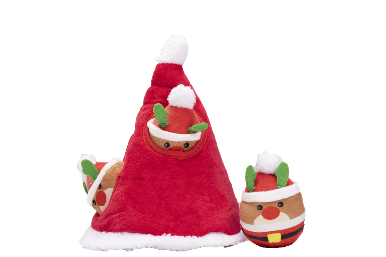 PLYŠOVÁ HRAČKA PRE PSOV SNIFFIES mini Santovia vo vianočnej čiapke s pískadlom a Vianočná čiapka: 22x18,5x18,5cm malý muž: 9,5x6,5x6cm"